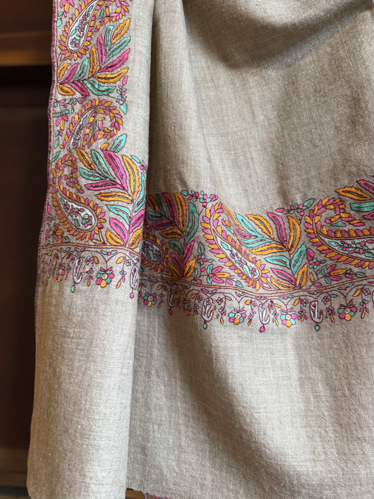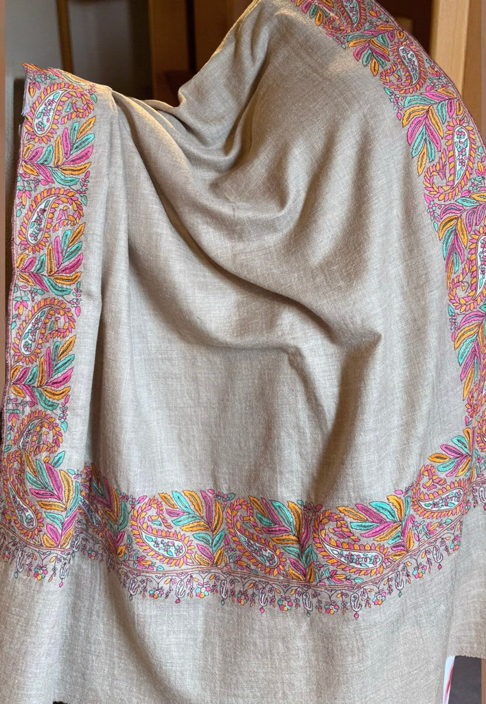 This exquisite pashmina shawl is a captivating blend of artistry and elegance. Handwoven with the finest cashmere, the intricate embroidery, featuring vibrant teal and rose blossoms intertwined with delicate paisley motifs, adds a touch of romanticism and exotic charm.